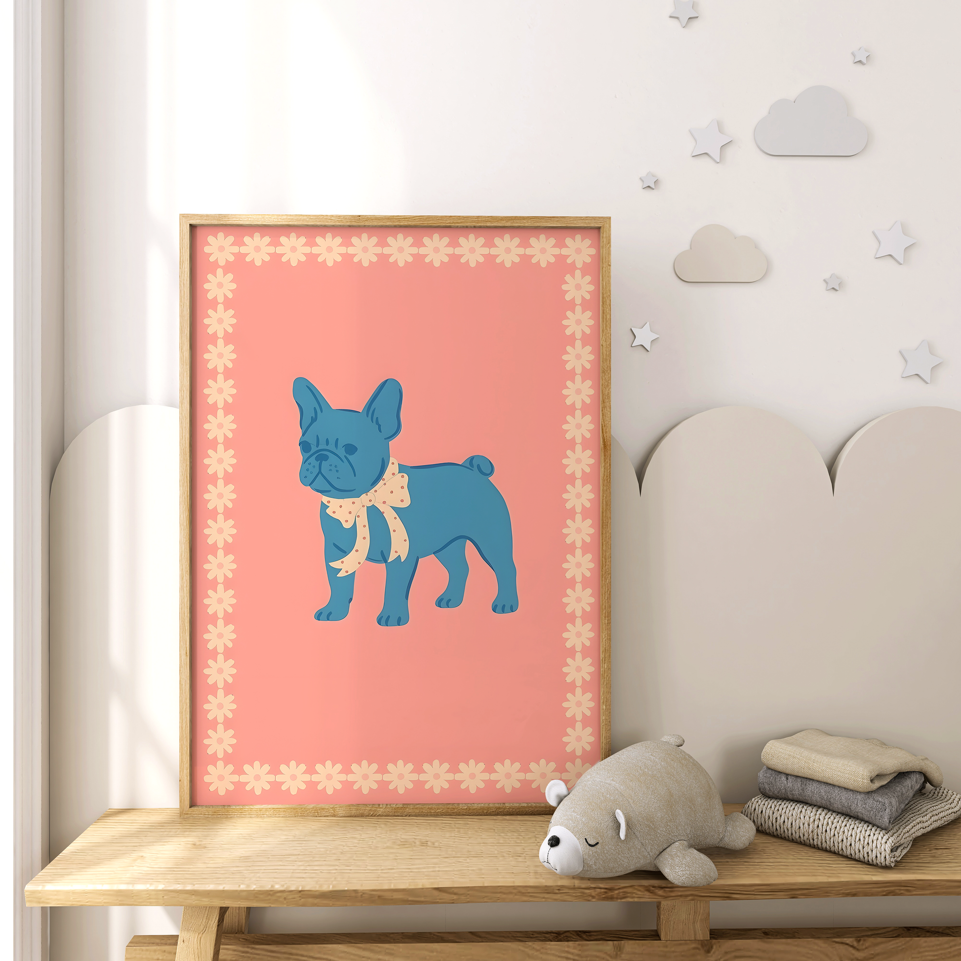Let’s be honest—this Frenchie has main character energy. Dressed in a polka-dot bow and surrounded by the sweetest daisy border, this blue French bulldog print is made for the coquette-core crowd, dog moms, or anyone who appreciates a little sass with their home decor.