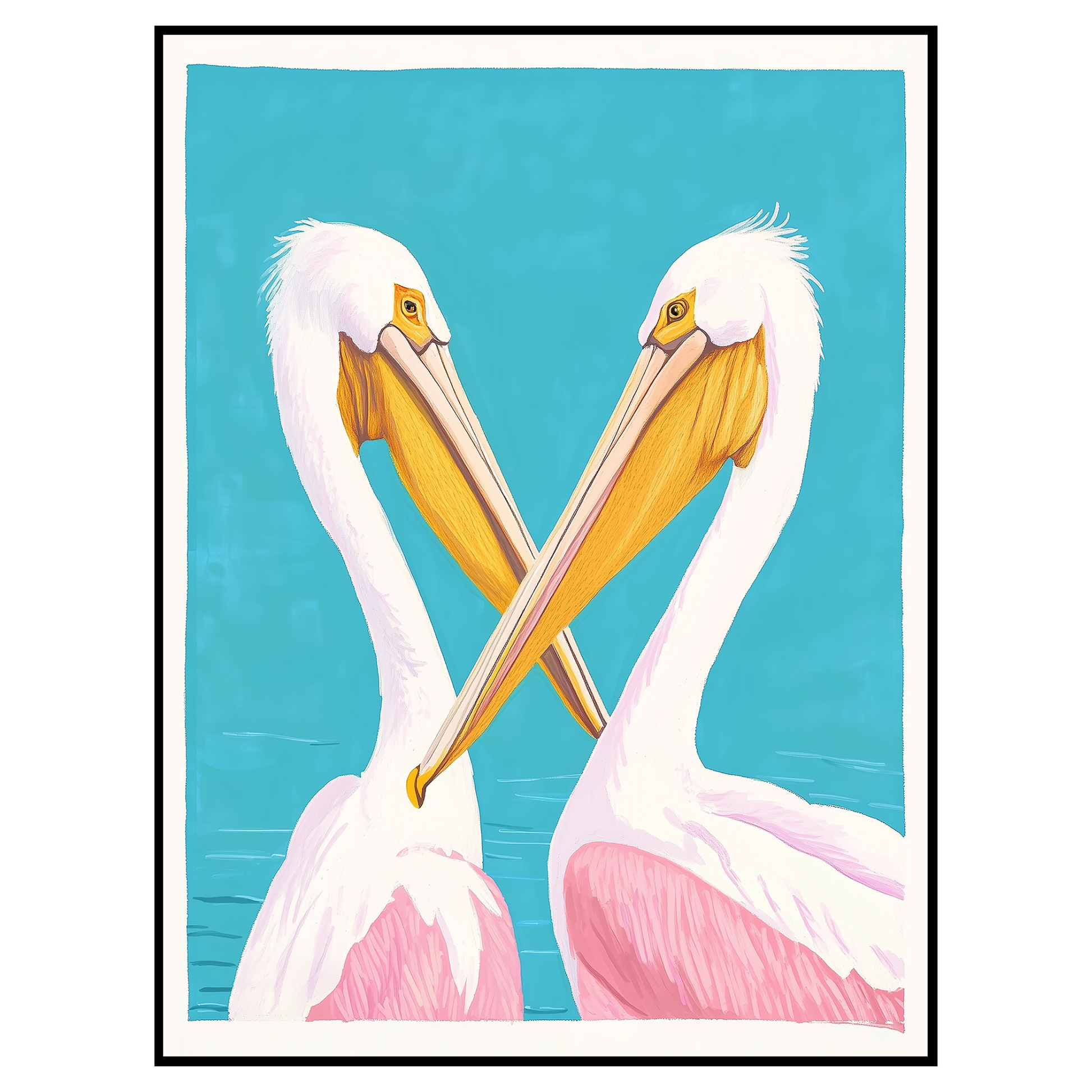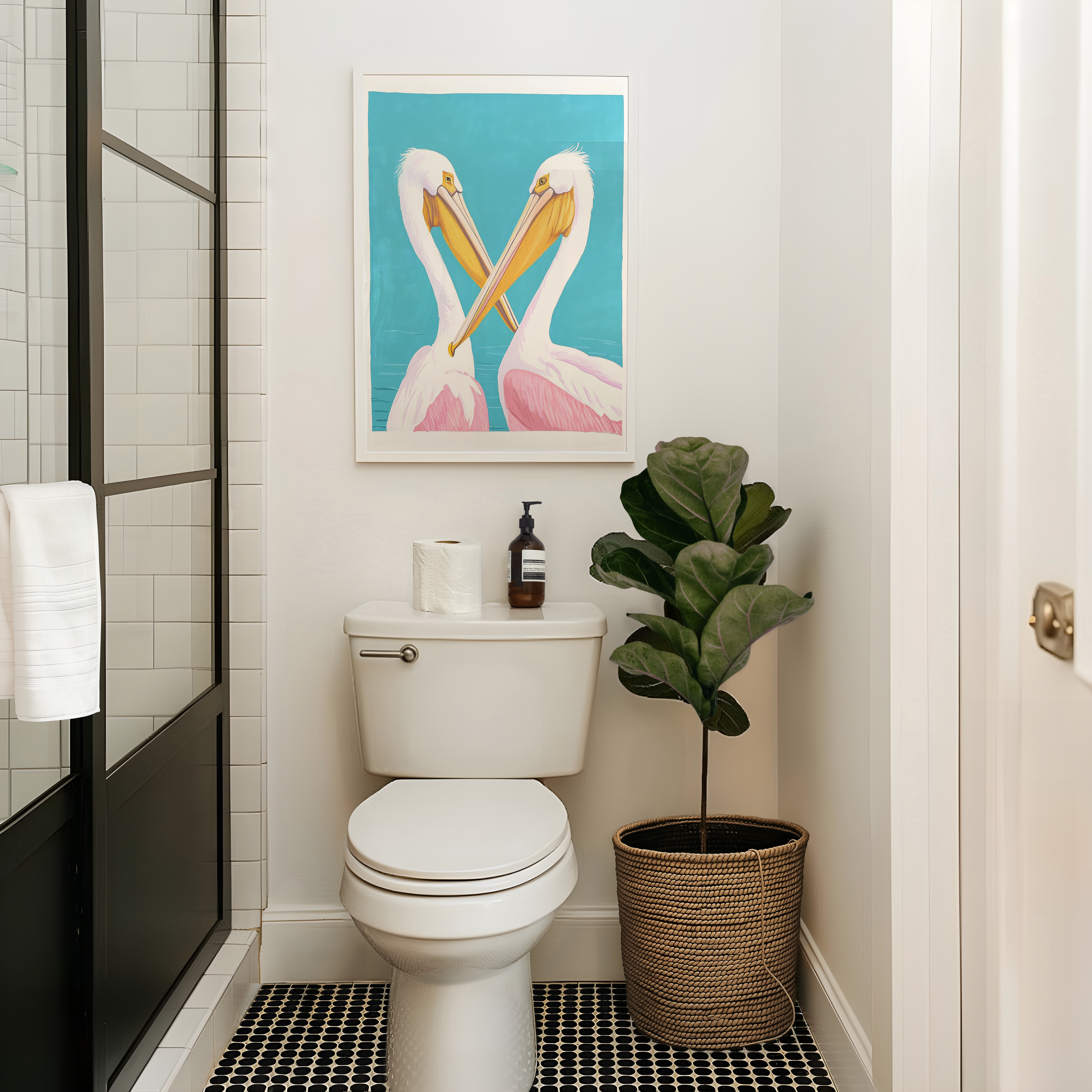 This vibrant pelican print brings a fresh, coastal vibe to any space. Inspired by the beauty of tropical birds and mid-century modern design, this print is perfect for adding a pop of color to your bathroom, bedroom, or home office. The bold hues of turquoise and coral make them a striking statement in beach houses or as part of a modern decor scheme.