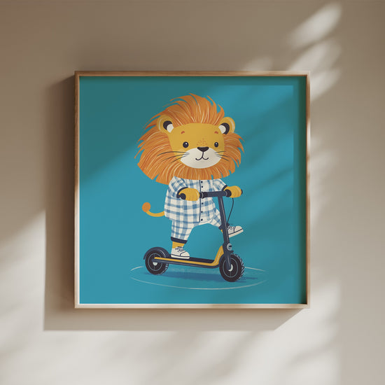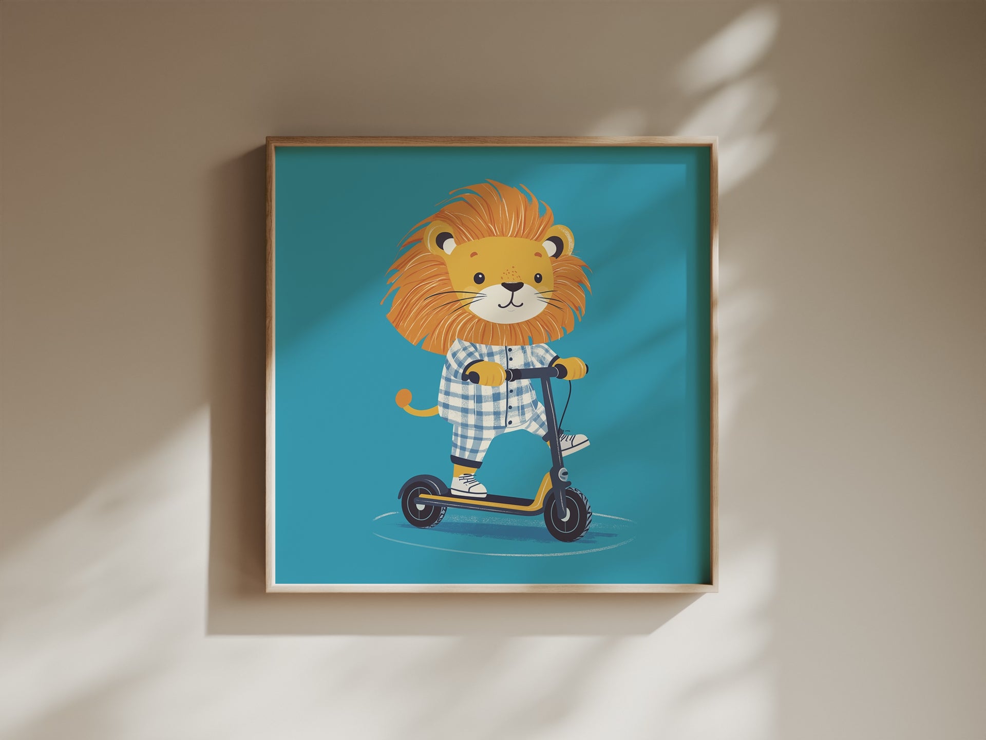 Bring a touch of joy and adventure to your child's room with this delightful art print featuring a charming lion riding a scooter. This fun and playful illustration is perfect for a nursery, playroom, or any child's bedroom, adding a burst of color and personality. The vibrant design is sure to capture your child's imagination and create a happy and welcoming environment.