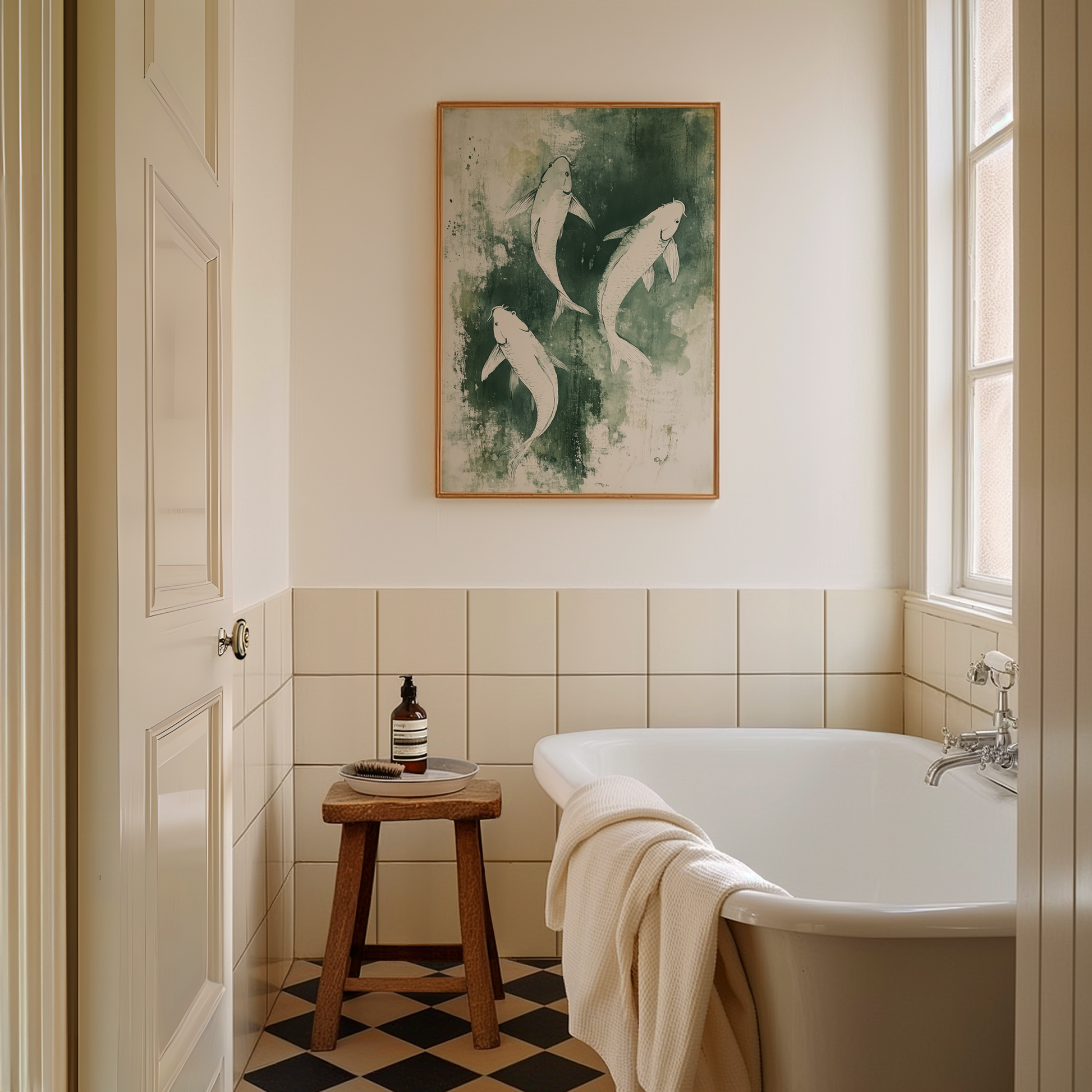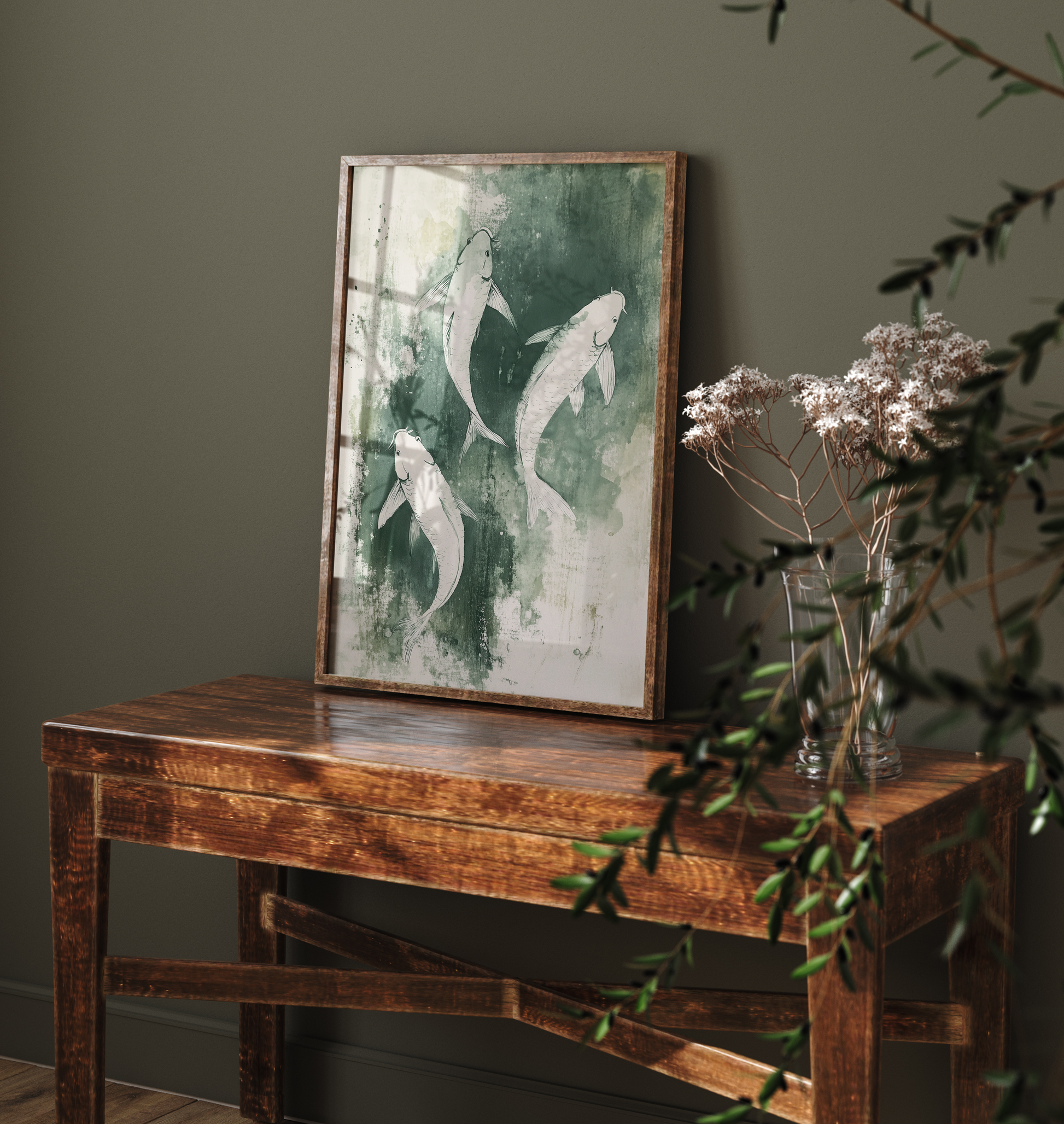 Transform your space with the serene beauty of this elegant koi fish watercolor artwork. Featuring three delicately illustrated koi in tranquil green tones, this minimalist print embodies a sense of calm and Zen-like harmony. Inspired by Japanese aesthetics, this artwork is perfect for adding a peaceful touch to living rooms, bedrooms, or meditation spaces.