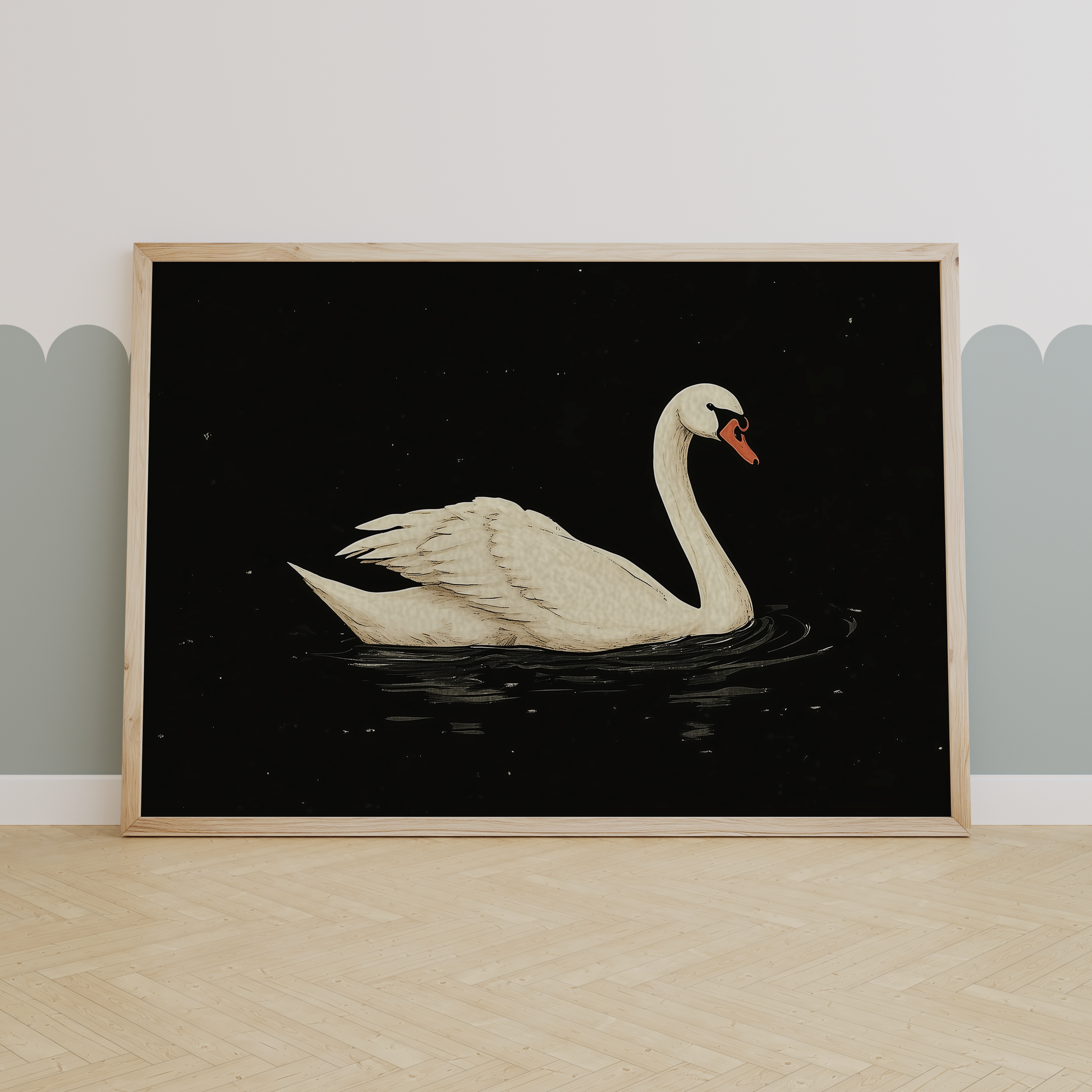 This stunning swan art print blends elegance and mystery with a dark academia-inspired aesthetic. Featuring a graceful white swan against a deep black background, this print adds sophistication to any space. Perfect for modern, minimalist, and classic interiors, it complements living rooms, bedrooms, or offices. Available in multiple sizes to fit various frame aspect ratios, making it easy to create a striking gallery wall or stand-alone statement piece.