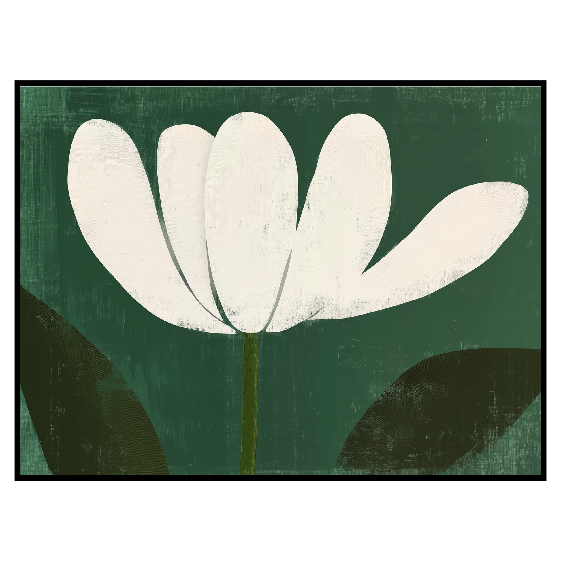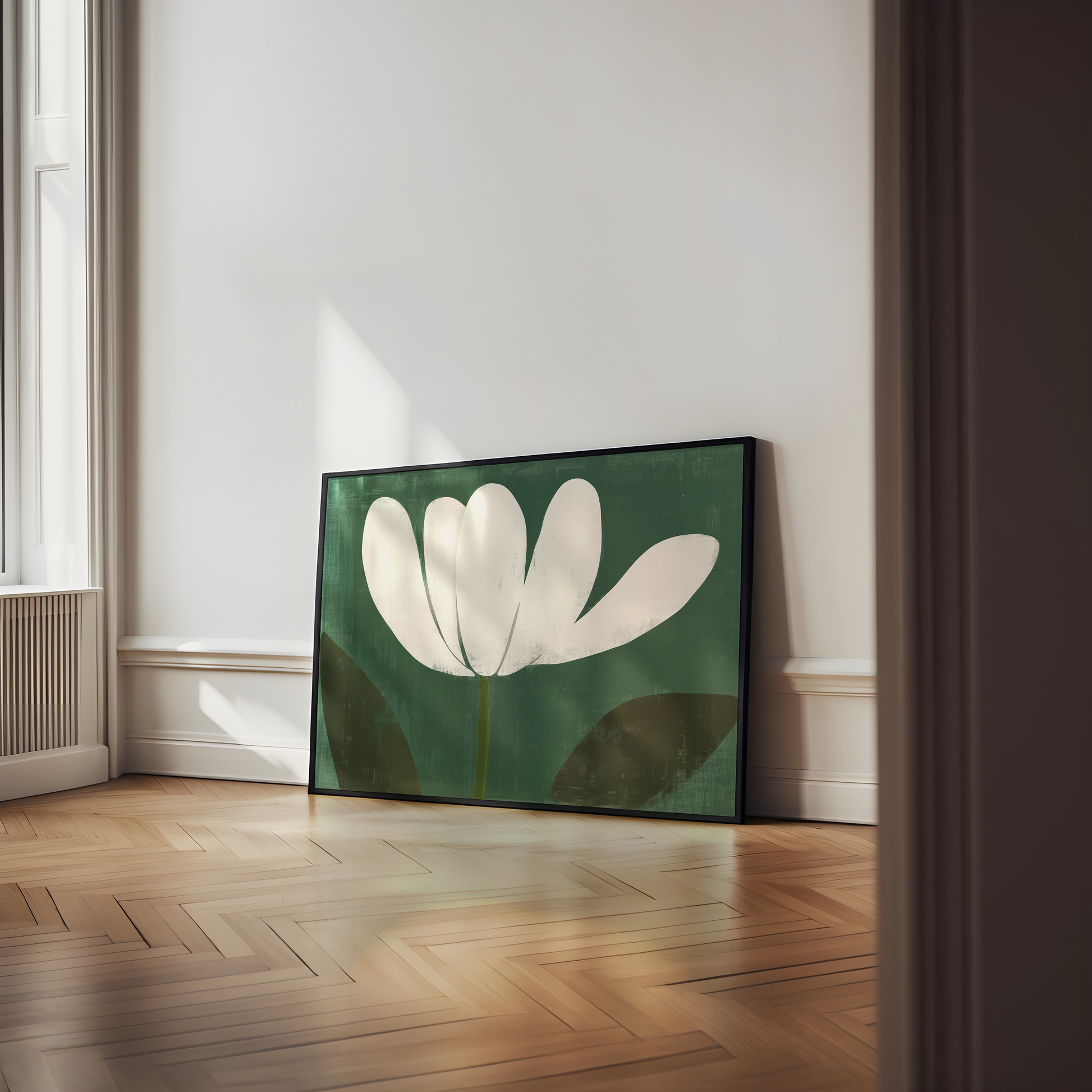 Add a touch of minimalist elegance to your space with this art print featuring a beautifully abstract white flower on a rich green background. Perfect for those who love mid-century modern and Scandinavian-inspired interiors, this botanical print complements various home decor styles like boho, Japandi, and contemporary. Ideal for gallery walls, living rooms, bedrooms, or offices, this art piece brings tranquility and sophistication to your environment.