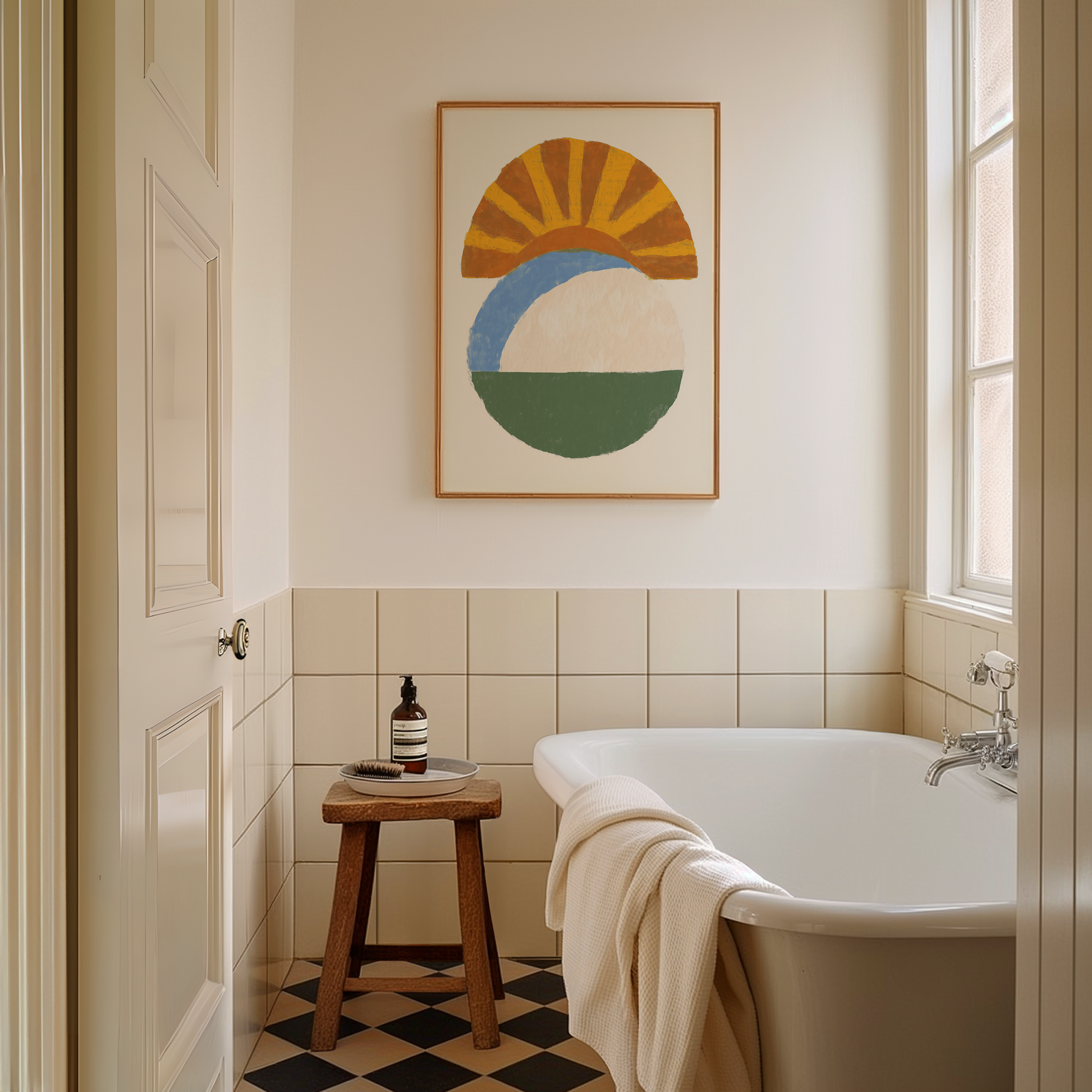 Transform your space with this stunning abstract sunrise art print, featuring warm earthy tones and a modern minimalist design. Perfect for boho, Scandinavian, or mid-century modern interiors, this artwork combines a serene landscape with vibrant sun rays in a bold, unique style. Ideal for living rooms, bedrooms, or offices, add a touch of warmth and tranquility to your decor with this versatile and trendy piece.
