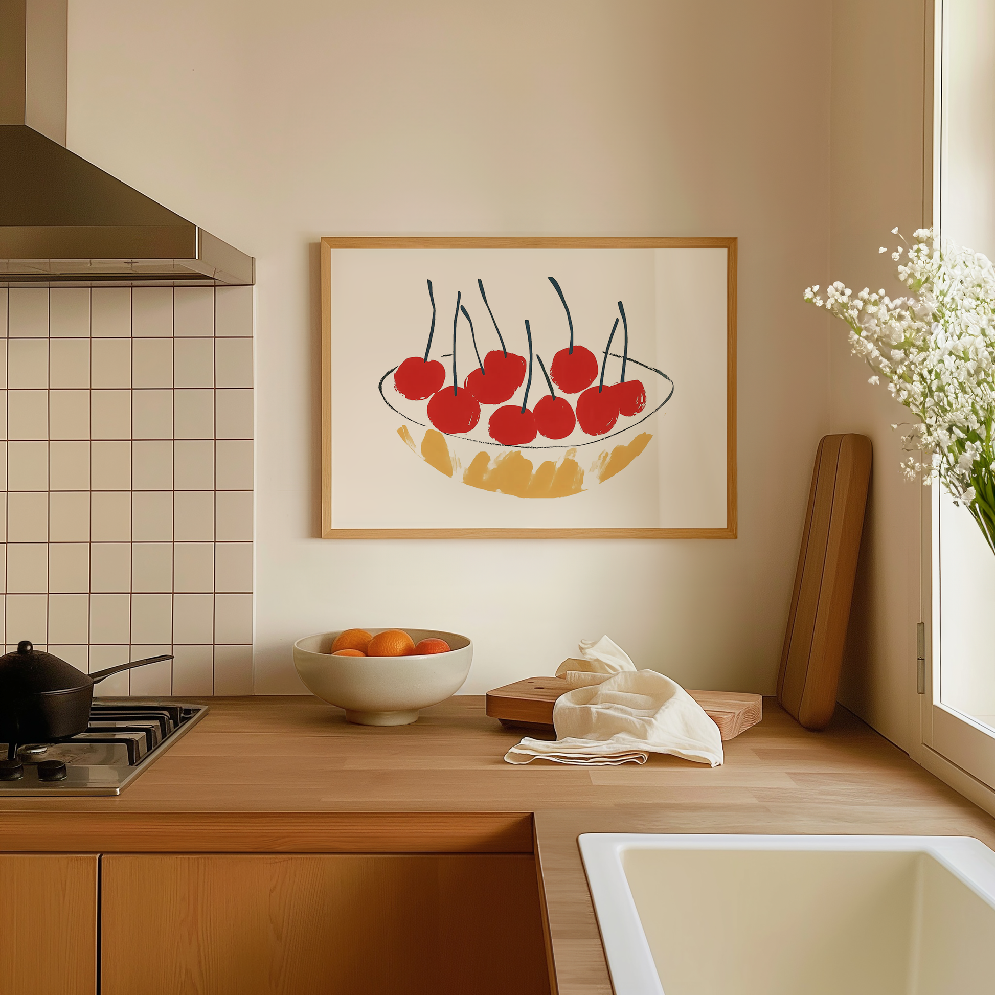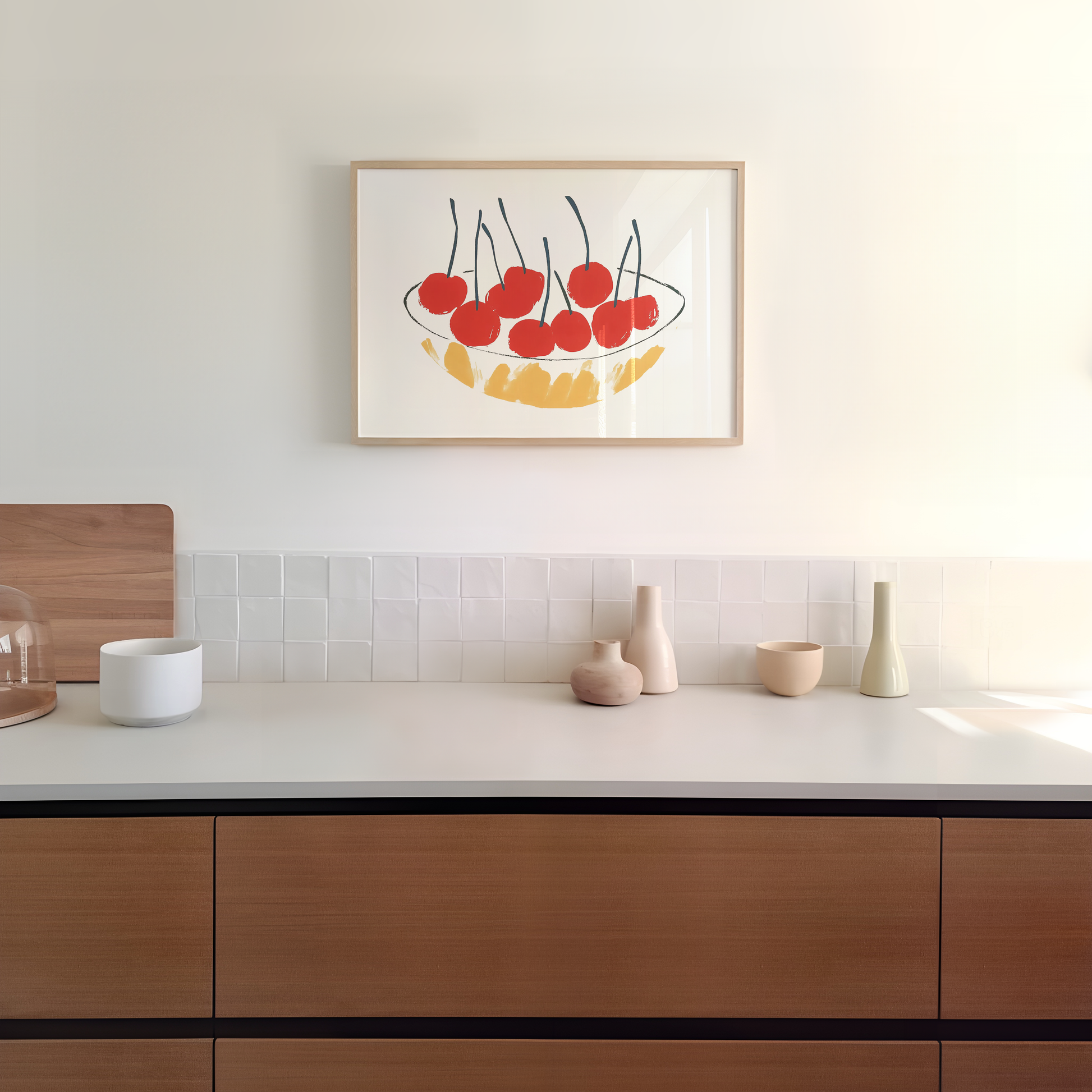 Brighten up your kitchen or living space with this bold and minimalist cherry art print. Featuring a playful bowl of vibrant red cherries against a clean and modern design, this artwork is perfect for adding a pop of color to your home. Ideal for kitchens, dining areas, or eclectic gallery walls.