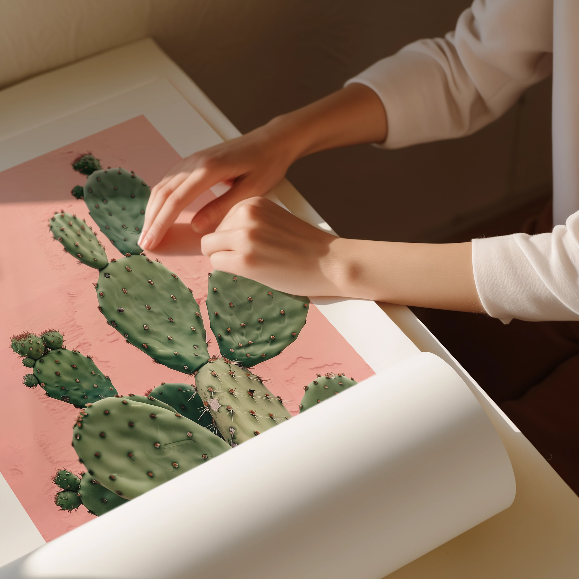 Embrace the vibrant charm of the desert with our 'Prickly Pear Cactus Print,' a masterpiece that combines the natural beauty of cacti with a modern, chic aesthetic. Set against a soft pink backdrop, this art print captures the unique texture and silhouette of the beloved prickly pear, bringing a touch of warmth and contemporary style to any room.