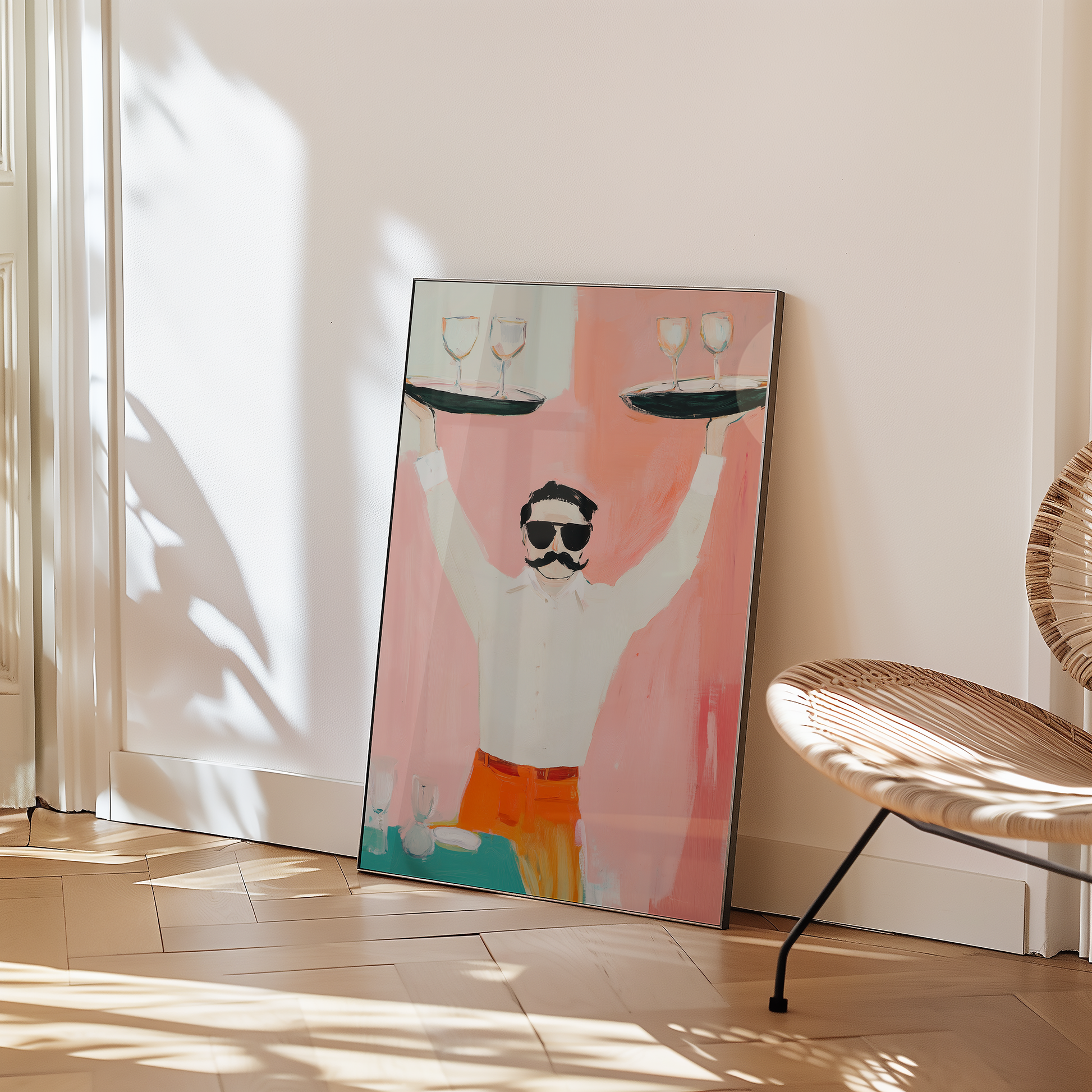 Add a splash of retro charm and vibrant personality to your space with this art print featuring a quirky, mustachioed waiter balancing trays of glasses against a bold pink background. Perfect for dining rooms, kitchens, or bar areas, this modern yet playful piece captures the spirit of joy and celebration. Each print is available in multiple sizes to fit your favorite frames and interior design needs. Ideal for creating a unique gallery wall or as a standalone conversation piece.