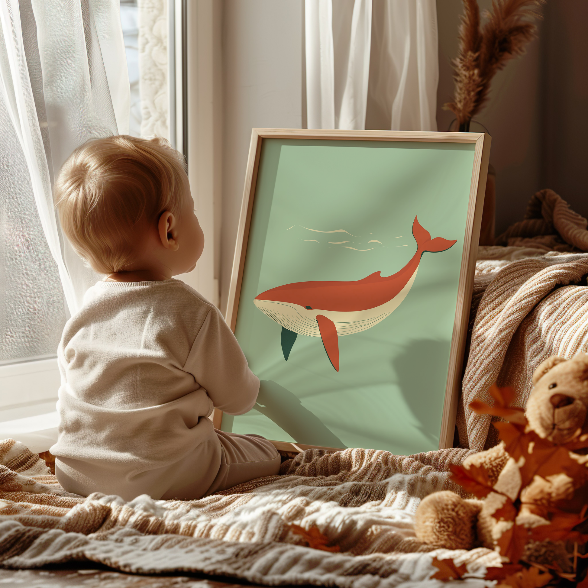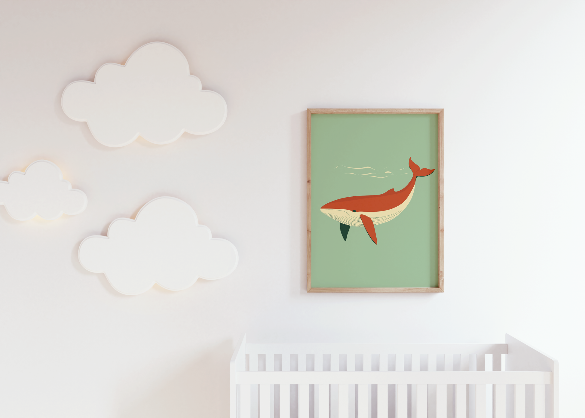 Bring a touch of ocean charm to your nursery with this whimsical minimalist whale print. Perfect for baby rooms, kids' spaces, or playrooms, this design features a soft yet playful whale illustration that complements gender-neutral decor styles. This artwork blends simplicity with a vibrant, friendly vibe.
